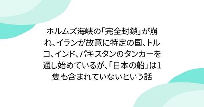 ホルムズ海峡の「完全封鎖」が崩れ、イランが故意に特定の国、トルコ、インド、パキスタンのタンカーを通し始めているが、「日本の船」は1隻も含まれていないという話