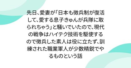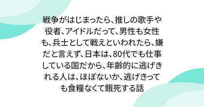戦争がはじまったら、推しの歌手や役者、アイドルだって、男性も女性も、兵士として戦えといわれたら、嫌だと言えず、日本は、80代でも仕事している国だから、年齢的に逃げきれる人は、ほぼないか、逃げきっても食糧なくて餓死する話
