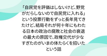 「自民党を評価はしないけど、野党がだらしないので自民党に入れる」という投票行動をずっと長年見てきたけど、結局それが何十年にもわたる日本の政治の腐敗と社会の衰退の最大の原因で、政権交代が少なすぎたのがいまの体たらくを招いたという話