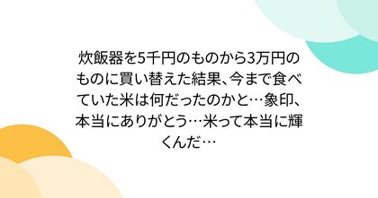 炊飯器を5千円のものから3万円のものに買い替えた結果、今まで食べていた米は何だったのかと…象印、本当にありがとう…米って本当に輝くんだ…