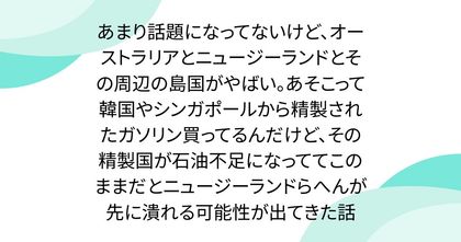あまり話題になってないけど、オーストラリアとニュージーランドとその周辺の島国がやばい。あそこって韓国やシンガポールから精製されたガソリン買ってるんだけど、その精製国が石油不足になっててこのままだとニュージーランドらへんが先に潰れる可能性が出てきた話