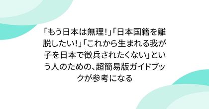 「もう日本は無理!」「日本国籍を離脱したい!」「これから生まれる我が子を日本で徴兵されたくない」という人のための、超簡易版ガイドブックが参考になる