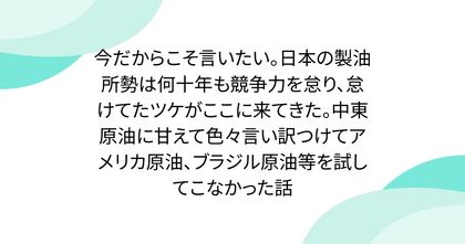 今だからこそ言いたい。日本の製油所勢は何十年も競争力を怠り、怠けてたツケがここに来てきた。中東原油に甘えて色々言い訳つけてアメリカ原油、ブラジル原油等を試してこなかった話