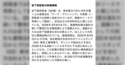 「もうテロだろこれ」国分寺でガソリン等を"4万リットル"下水に投棄した社員4人が逮捕「台所の排水溝にカップめんの残り汁を流す程度と思った」との供述