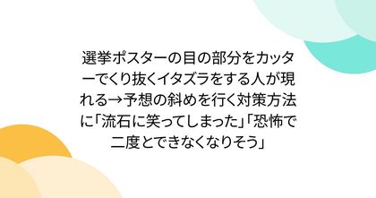 選挙ポスターの目の部分をカッターでくり抜くイタズラをする人が現れる→予想の斜めを行く対策方法に「流石に笑ってしまった」「恐怖で二度とできなくなりそう」