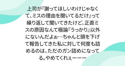 上司が『謝ってほしいわけじゃなくて、ミスの理由を聞いてるだけ』って繰り返して聞いてきたけど、正直ミスの原因なんて極論『うっかり』以外にないんだよぉ…ちゃんと頭を下げて報告してきた私に対して何度も詰めるのは、ただのガン詰めになってる。やめてくれぇーーー