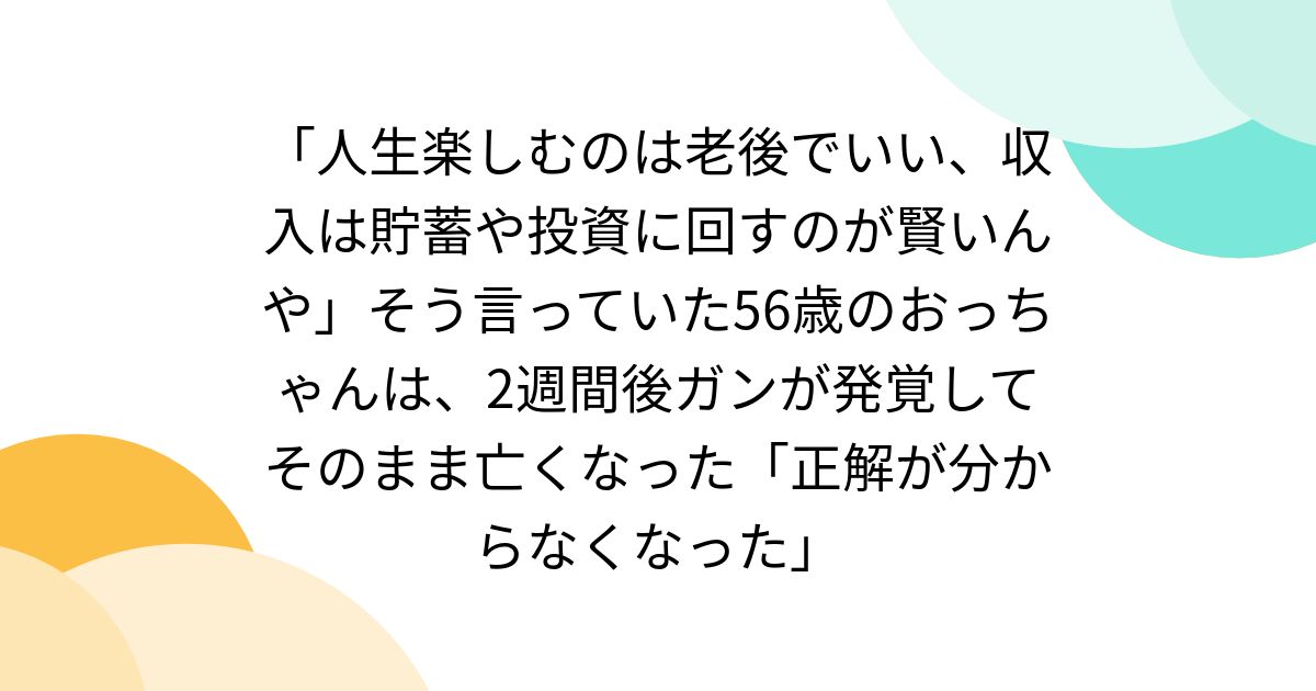 「人生楽しむのは老後でいい、収入は貯蓄や投資に回すのが賢いんや」そう言っていた56歳のおっちゃんは、2週間後ガンが発覚してそのまま亡くなった「正解が分からなくなった」