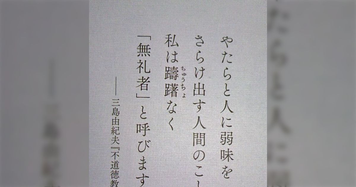 differential三島はこんなことばっか言ってるから、美輪明宏にフラれたり、吉田健一(吉田茂の息子で麻生太郎の伯父)に俗物の罵られたり、心神耗弱して割腹自殺する羽目になる。自業自得とはいえお気の毒やね。