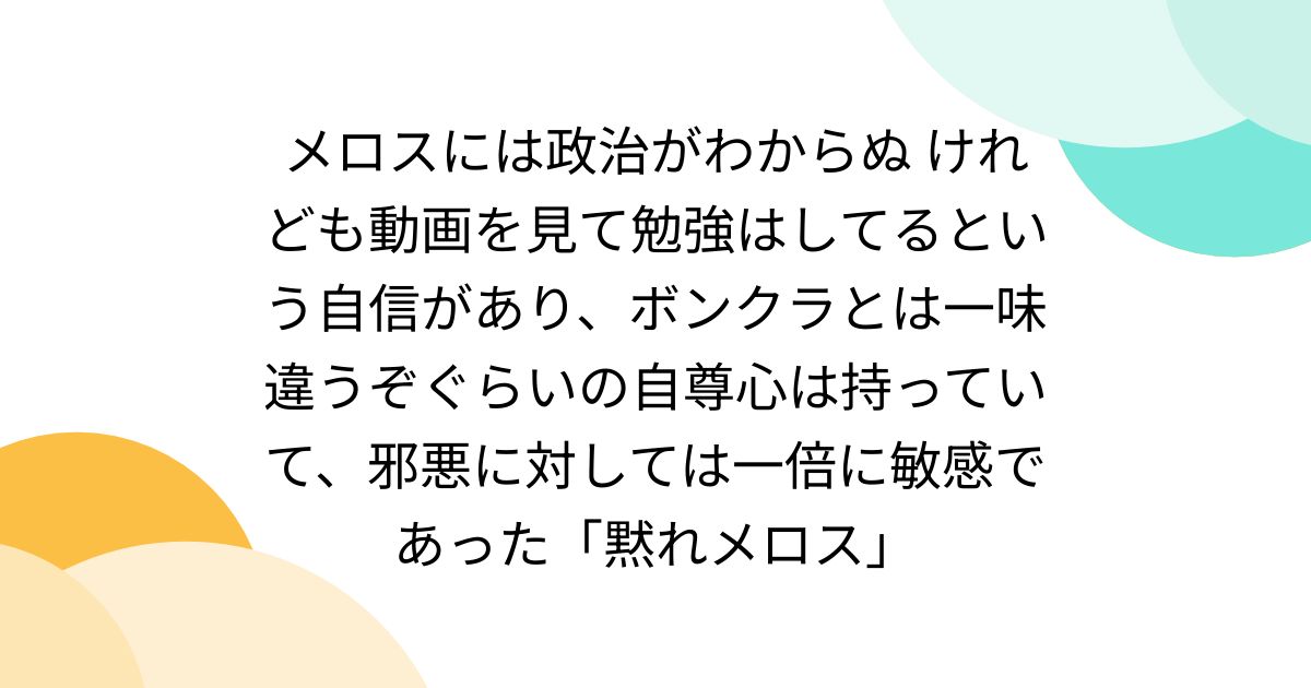 メロスには政治がわからぬ。けれども動画を色々見て勉強はしてるという自信があり、普段からSNSで意見表明したり他人と議論したりしていてそのへんのボンクラとは一味違うぞぐらいの自尊心は持っていて、邪悪に対しては、人一倍に敏感であった。 黙れメロ...