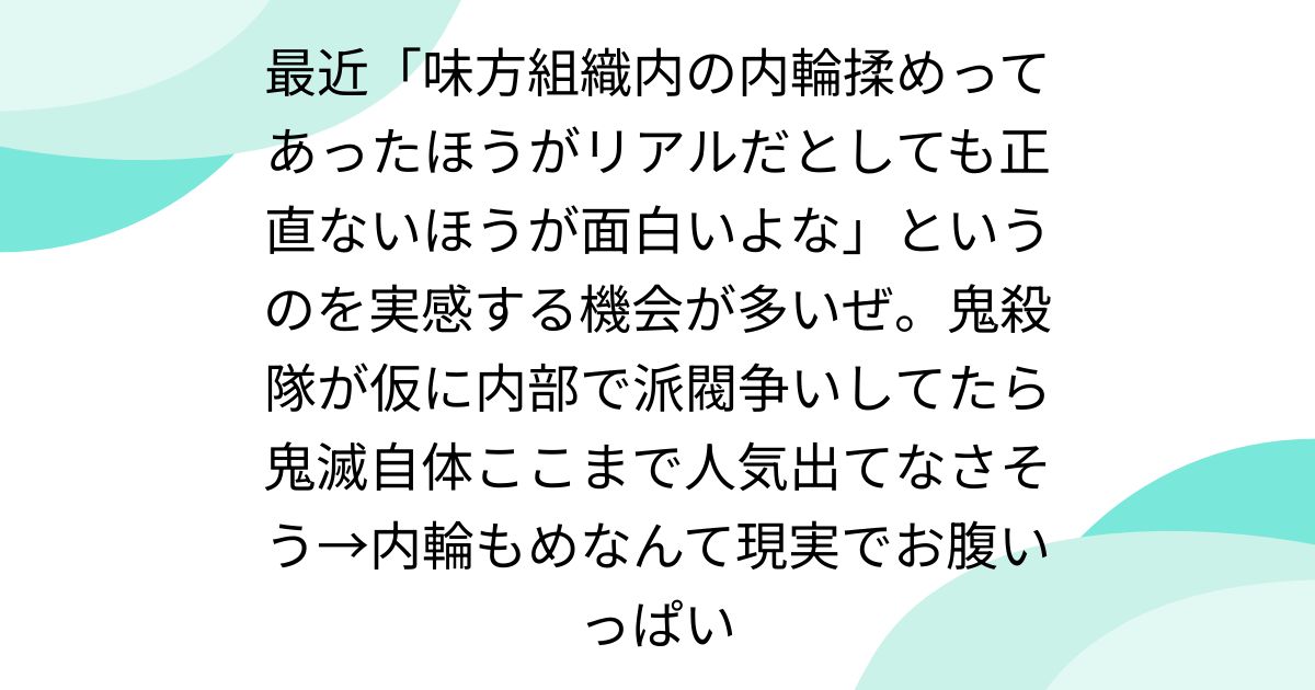 最近「味方組織内の内輪揉めってあったほうがリアルだとしても正直ないほうが面白いよな」というのを実感する機会が多いぜ。鬼殺隊が仮に内部で派閥争いしてたら鬼滅自体ここまで人気出てなさそう→内輪もめなんて現実でお腹いっぱい
