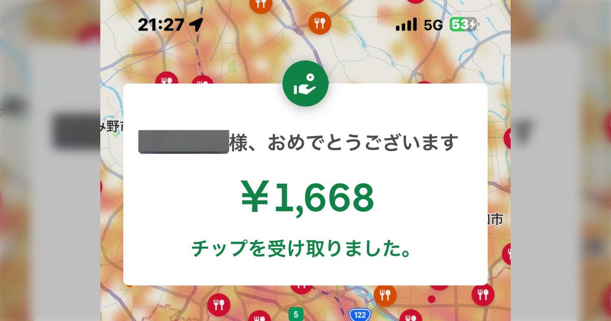 Uberの置き配の写真、自撮りしたら4桁チップ貰えた→女性がやっていると思われるも「34歳のかわいいおっさんです」